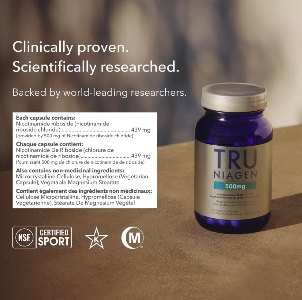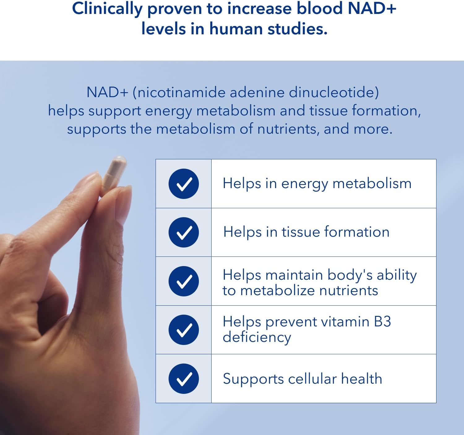 - CLINICALLY PROVEN NAD+ NATURAL HEALTH PRODUCT: Tru Niagen is clinically proven to increase blood NAD+ levels to support cellular health. Contains patented Niagen, a form of vitamin B3 that helps in energy metabolism and tissue formation. Helps maintain the body's ability to metabolize nutrients and prevents vitamin B3 deficiency.