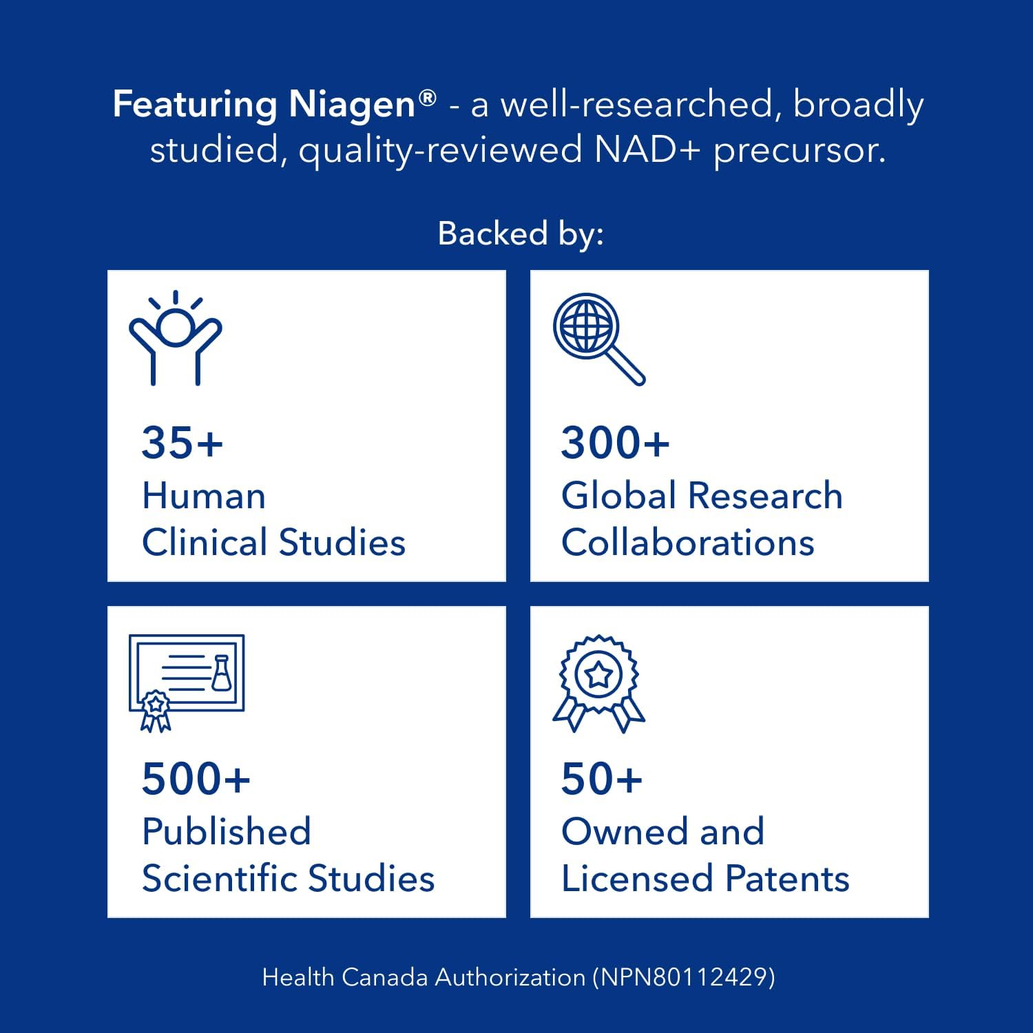 - EXTENSIVE SCIENTIFIC BACKING: Our key ingredient, patented Niagen (nicotinamide riboside chloride) is backed by 35+ peer-reviewed, published human clinical studies, 400+ published studies, and decades of research. Backed by a Nobel Prize winner and 300+ global research collaborations. Multiple peer-reviewed studies confirm Niagen effectively increases blood NAD+ levels. Decades of research validate NAD+ supplementation for supporting cellular health and energy metabolism.